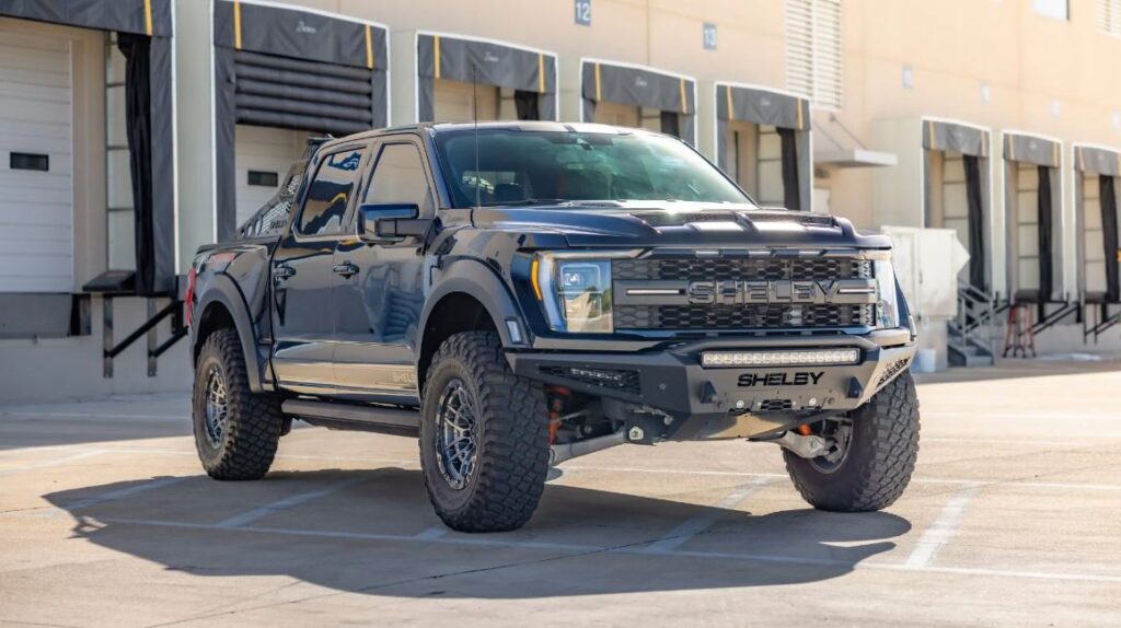 Finished in stunning Antimatter Blue Metallic with a bold Shelby dual-scoop hood, steel bumpers with integrated LED lighting, and powered steps with rock sliders